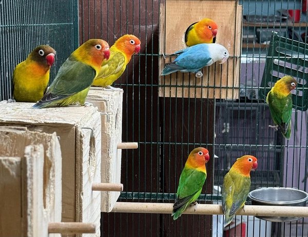 Comments: the blue opaline female is breeding with one of the boys but had a stroke a couple of months ago but is still mating and laying with the male. another pair has laid also and there is a third pair will start soon. you can see 8 in thepic the 9th one is in the box getting ready to lay